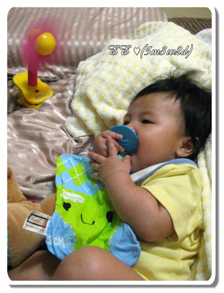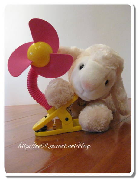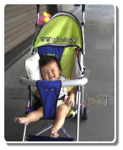EE坐著嬰兒車, 夾個酷涼扇. 有自然的微風, 也有"人造風".