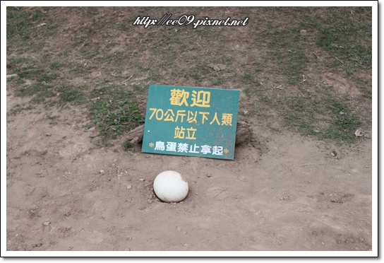 空地上還有顆駝鳥蛋, 牌子上寫著: [歡迎70公斤以下人類站立.]