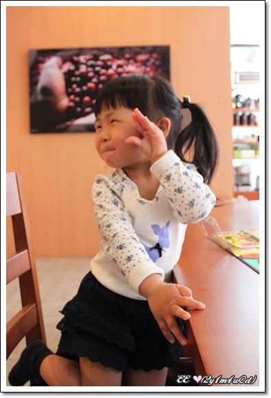 已經坐定在遊戲間的EE要馬麻陪她一起畫畫.