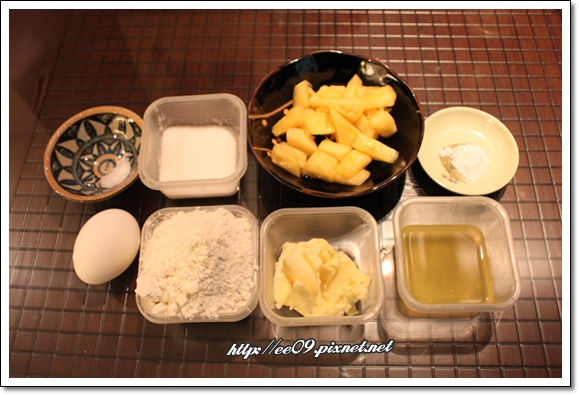 低筋麵粉100g,泡打粉1/2茶匙,鳳梨汁50cc,全蛋1個,