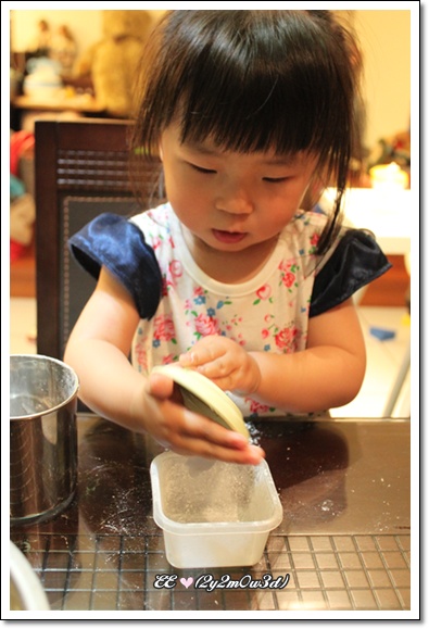 當然, 低筋麵粉可不能過度攪拌哪. 所以後來就讓她玩玩小盤子上的粉.